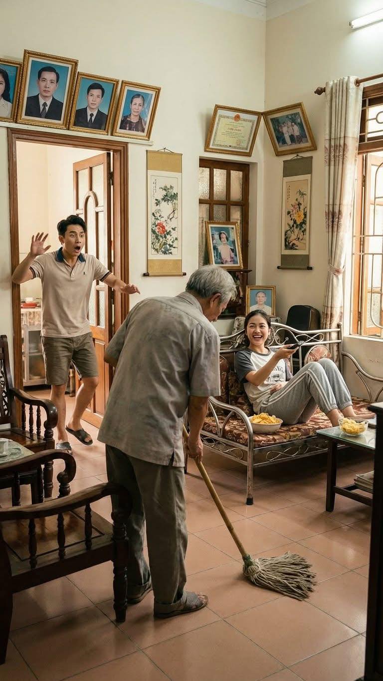 Hôm đó, Hùng bất ngờ đi làm về sớm thì bắt gặp cảnh tượng bố chồng con dâu g/ây cho/á/ng. Vợ anh thoải mái nằm trên sofa ăn uống, xem tivi. Trong khi đó bố anh phải hì hục lau dọn nhà cửa, m/ồ h/ôi chảy r/òng r/òng. Bố anh quét đến đâu, vợ anh lại vứt thức ăn đến đó. Nhìn thấy cảnh tượng này, anh vô cùng ph/ẫ/n n/ộ.