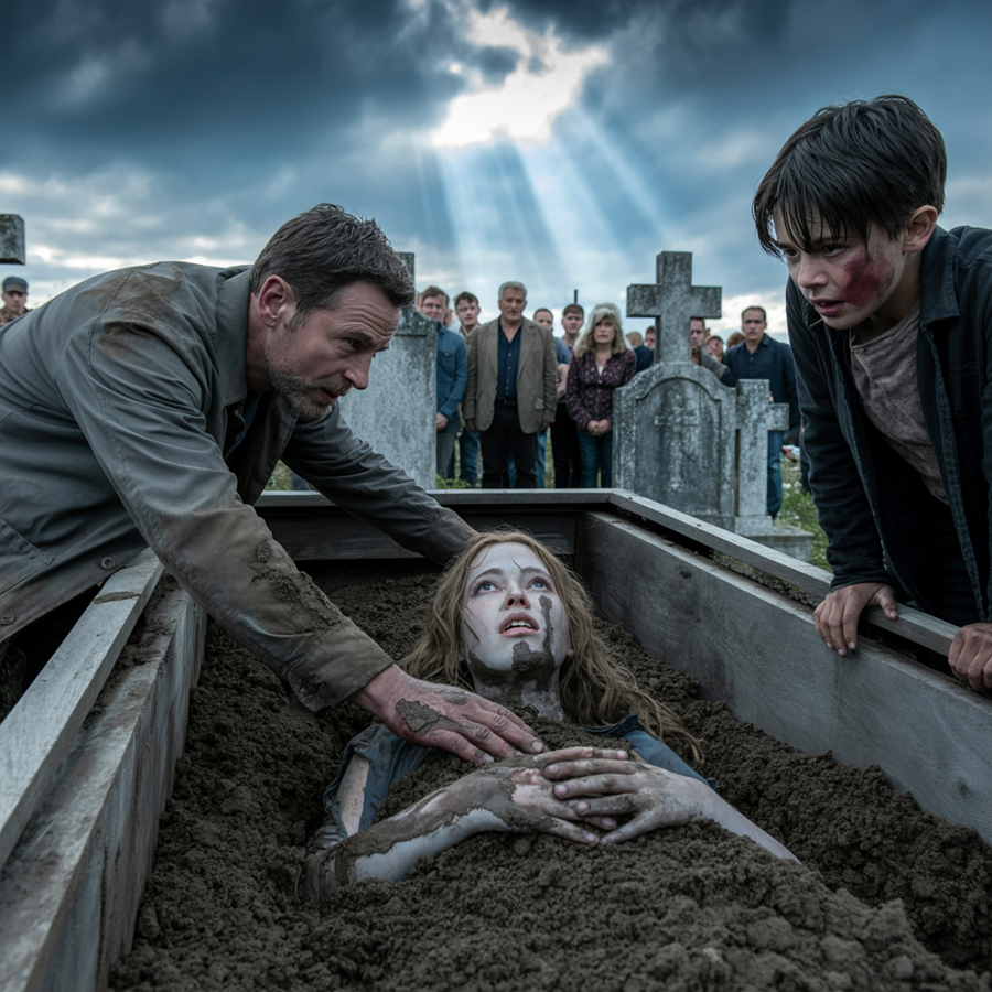 Someone screamed for an ambulance. Another person vomited into the grass. I climbed into the coffin without thinking, dirt soaking through my suit, cradling Anna’s head as if letting go might undo the miracle. Her lips moved, dry and cracked.