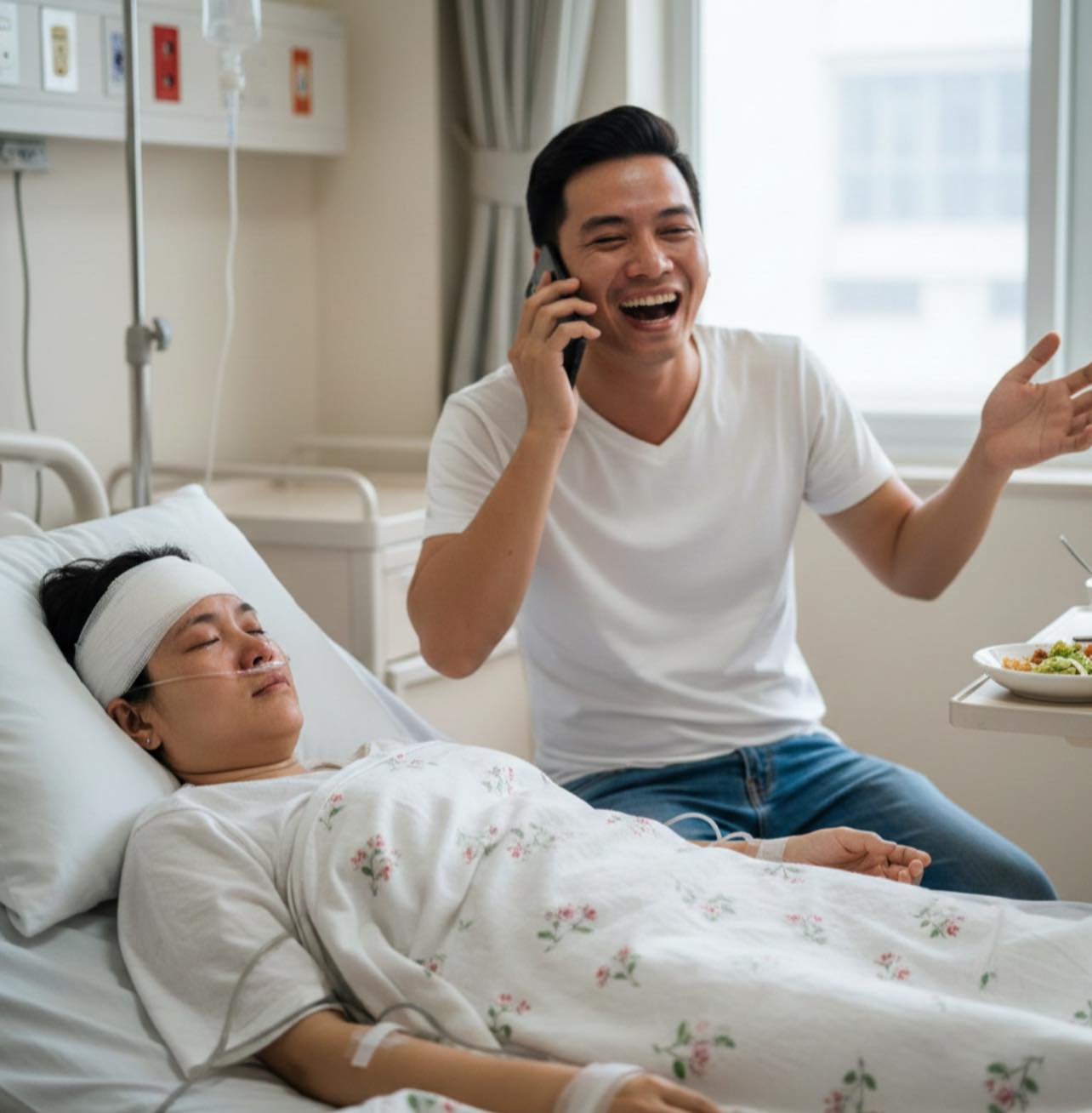 Hà gi/ả v/ờ ngủ s/ay trên giường bệnh, nhưng tai vẫn lắng nghe mọi âm thanh. Bên ngoài phòng, chồng cô – Tuấn – đang nói chuyện điện thoại, giọng hạ thấp nhưng không gi//ấu được sự phấn khích: