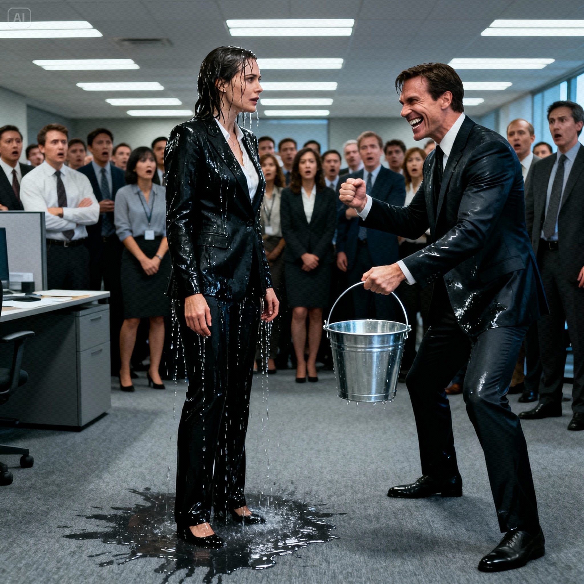 And now—three hours later—she stood drenched in cold water, the office frozen in horror, her clothes soaked but her spine unbroken.
