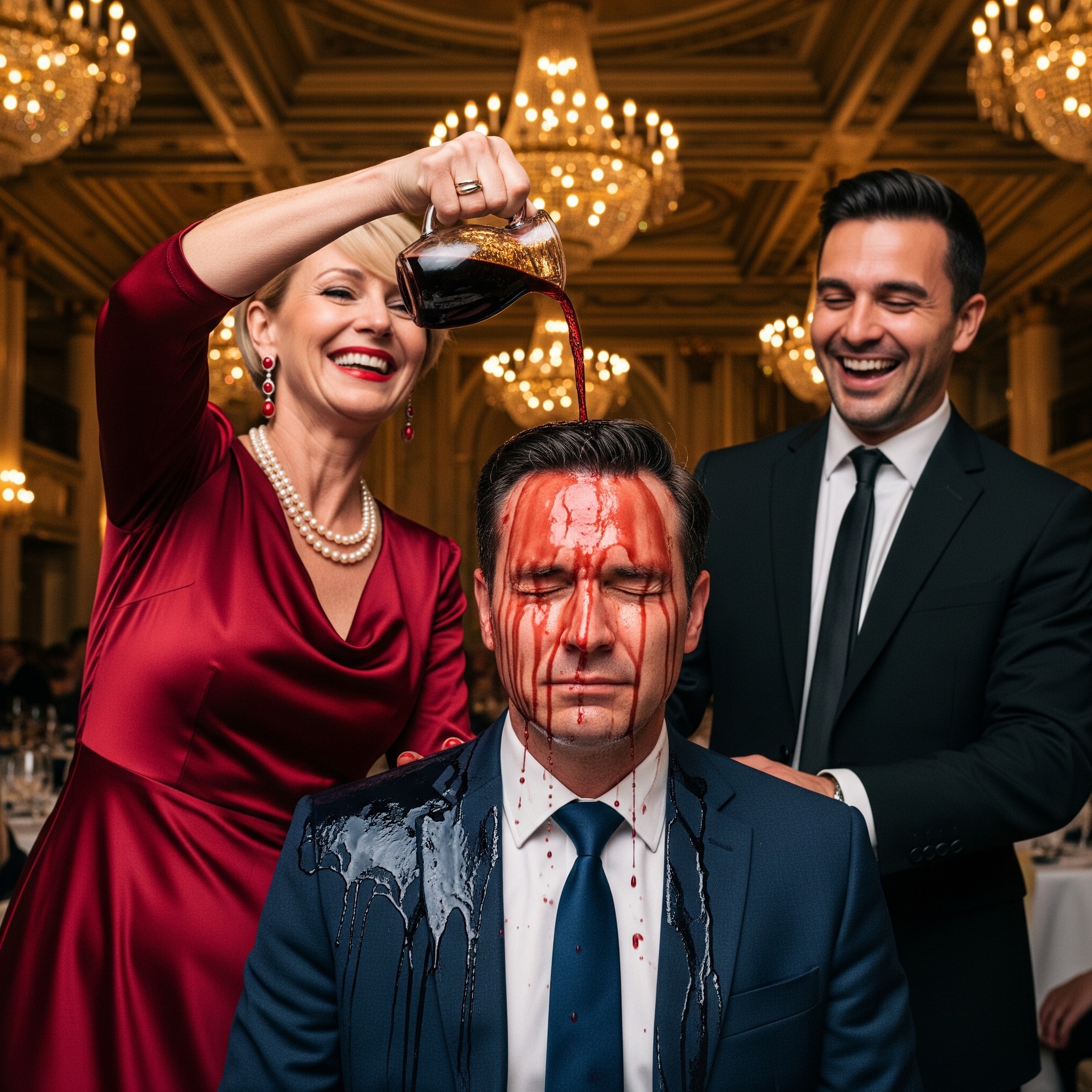 A dark splash spread across Leo’s chest, dripping down the fabric in slow humiliation. Laughter echoed around them as Serena leaned forward, her perfume suffocating.