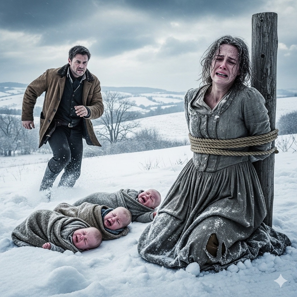 He found the clearing by an old fence post, half-rotted, half-buried under drift. A woman was lashed to it with barbed wire, arms pinned behind her, flesh torn where rust bit. Snow frosted her lashes; her hair had frozen in ragged strands. At her boots lay three bundled infants wrapped in a shredded nightgown—one mewling weakly, two gone quiet.