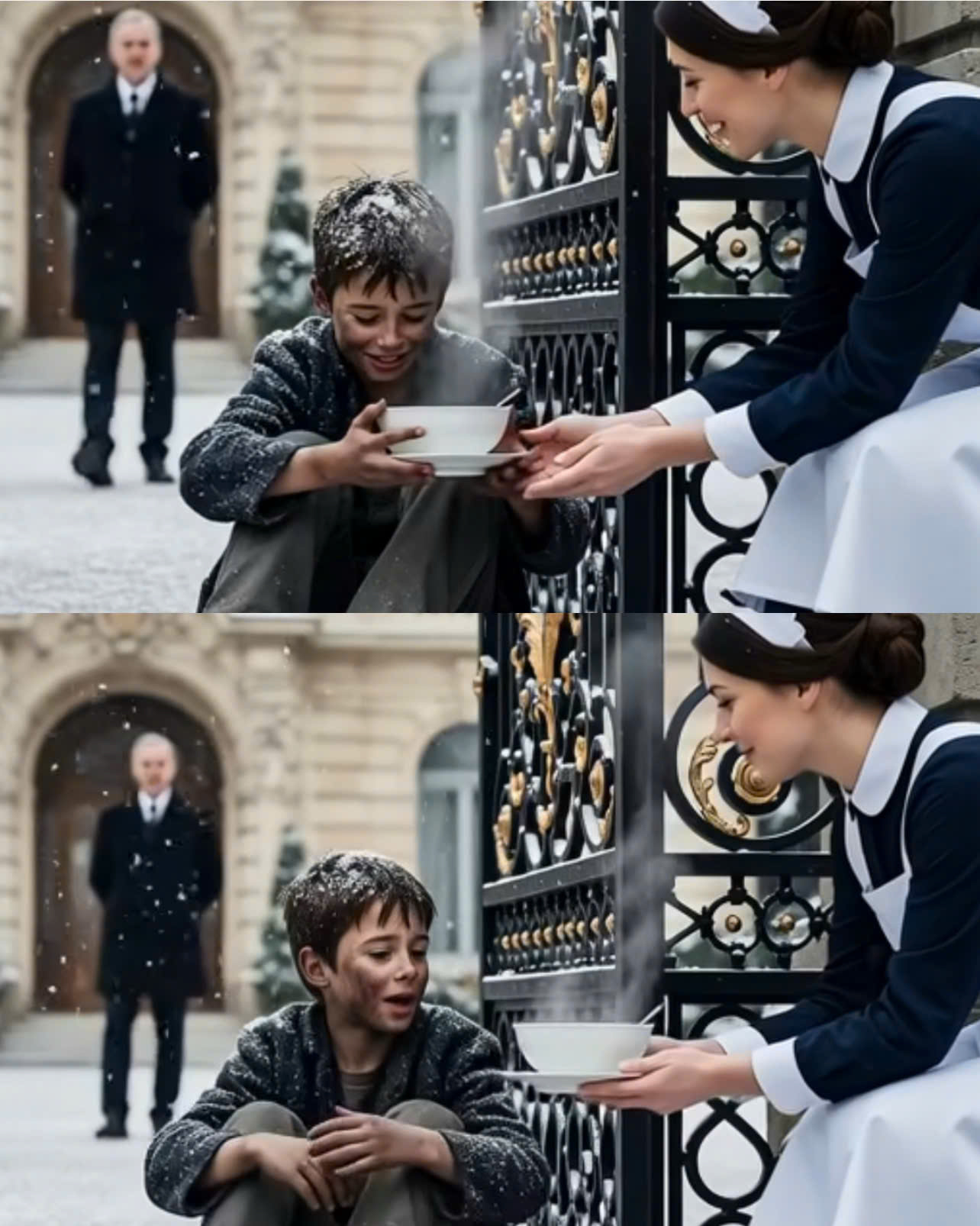 A kind maid saw a small, starving boy shivering outside the mansion gates. Believing her wealthy boss was gone for the day, she risked everything to sneak him into the kitchen and give him a hot meal. But her boss returned home early, her face pale with terror, ready to be fired. …The billionaires’ reaction left her utterly sh0cked, freezing her in place…