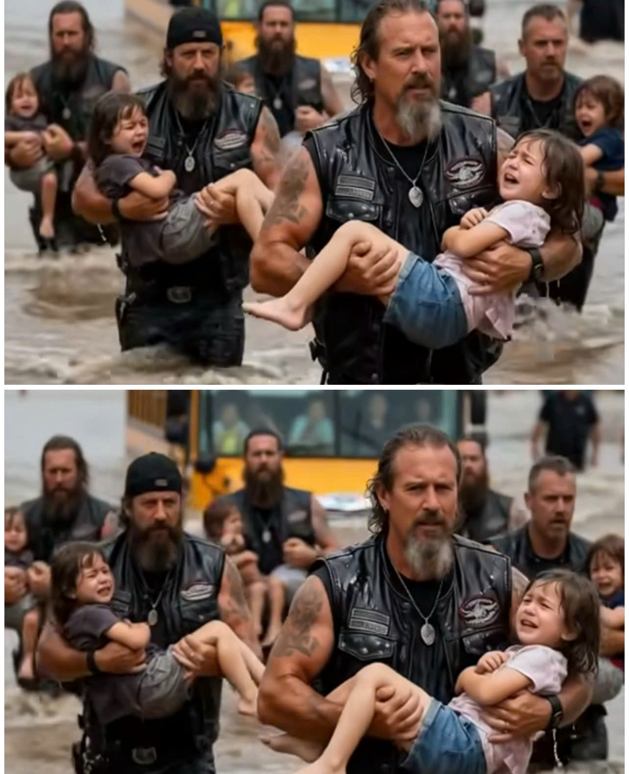 For a few eternal seconds, there was nothing but chaos — the roar of the flood, the screaming wind, and the cries of terrified children. The bus vanished completely beneath the waterline. The bikers’ human chain trembled under the current, knuckles white, boots sliding in the mud.