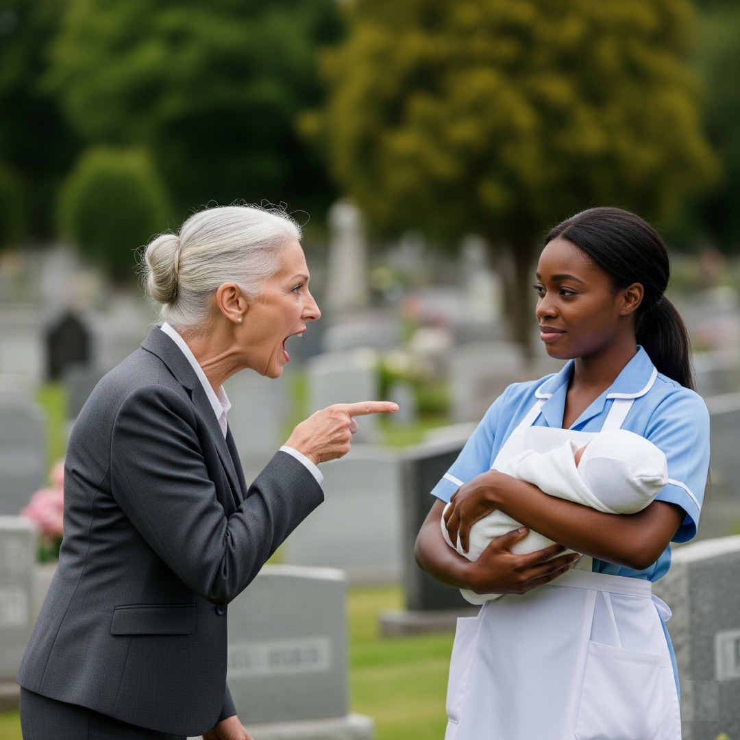 There, kneeling before William’s grave, was a young Black woman in a faded blue waitress uniform. Her apron was crumpled. Her shoulders trembled. In her arms, wrapped in a soft white blanket, was a baby — maybe a few months old.