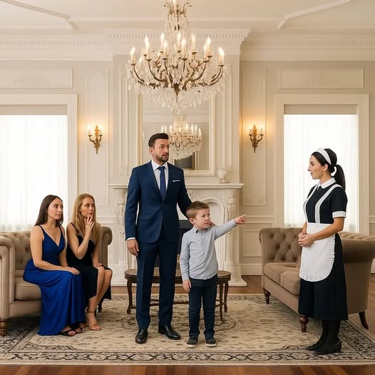 Daniel’s gaze swept over the three women. They were beautiful, glamorous, and polished, but something about their rehearsed smiles made him shrink back. His little hand trembled, and he glanced toward the far side of the room—where Isabella, the young maid, stood quietly in her uniform. She wasn’t supposed to be part of this scene at all. She was just the help, hired to keep the household in order.