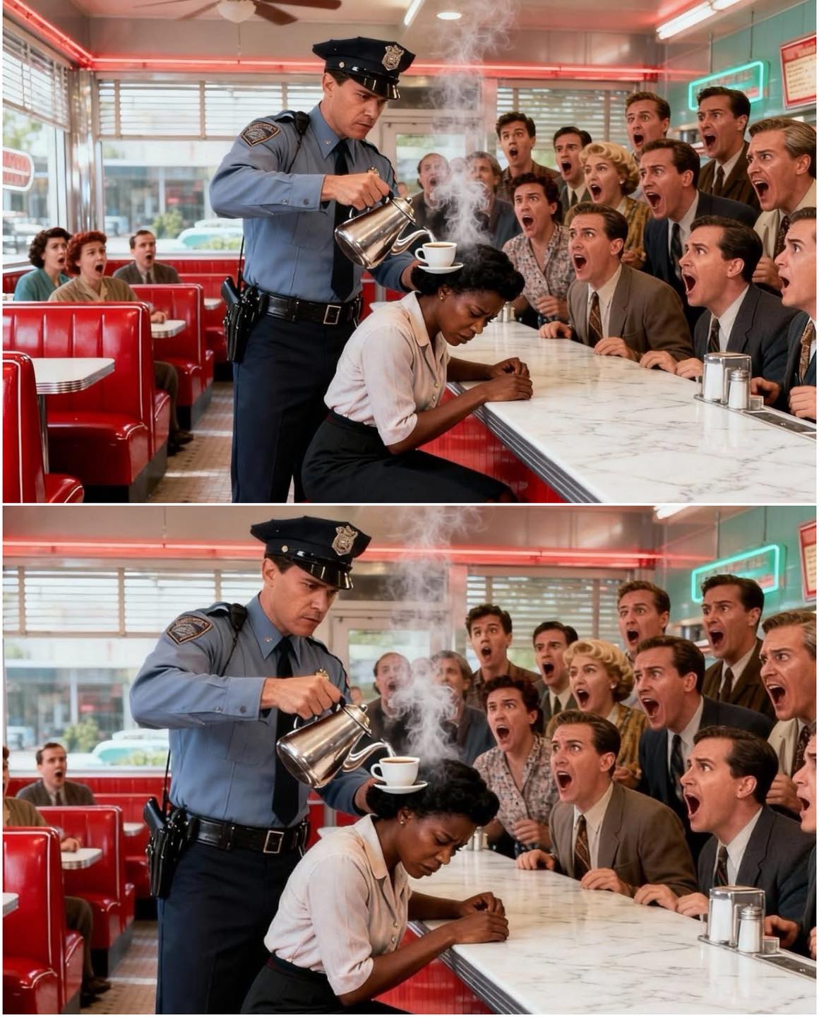 At the counter sat Officer Greg Daniels — a white cop in his early forties, uniform slightly wrinkled, eyes tired but sharp with arrogance. He’d been coming to this diner every morning for years. Everyone knew his temper, but nobody challenged him.