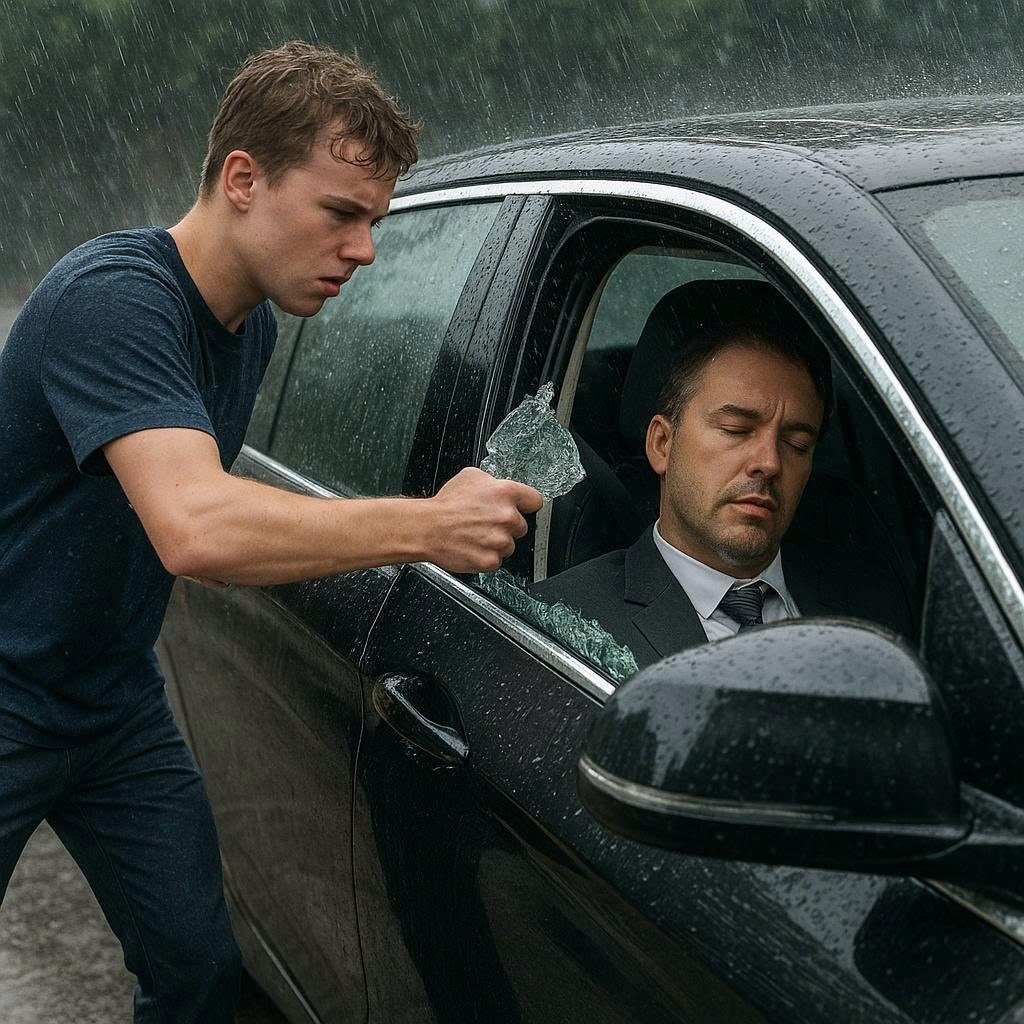 He pulled over, jumped out into the rain, and ran to the car. He banged on the window — no response. Without a second thought, he grabbed a rock and smashed the glass.