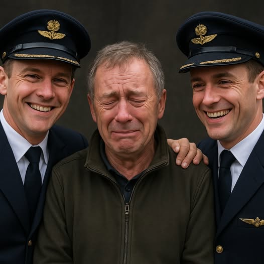 An old man in a worn jacket stood between two young pilots in crisp blue uniforms. His name was George Miller, a man whose weathered face told stories of hardship and sacrifice. As his sons, Ethan and Daniel, linked their arms through his, his shoulders trembled. Tears streamed down his cheeks, while the two young men smiled through misty eyes, gently patting their father’s back—as if to say, “Dad, we made it.”