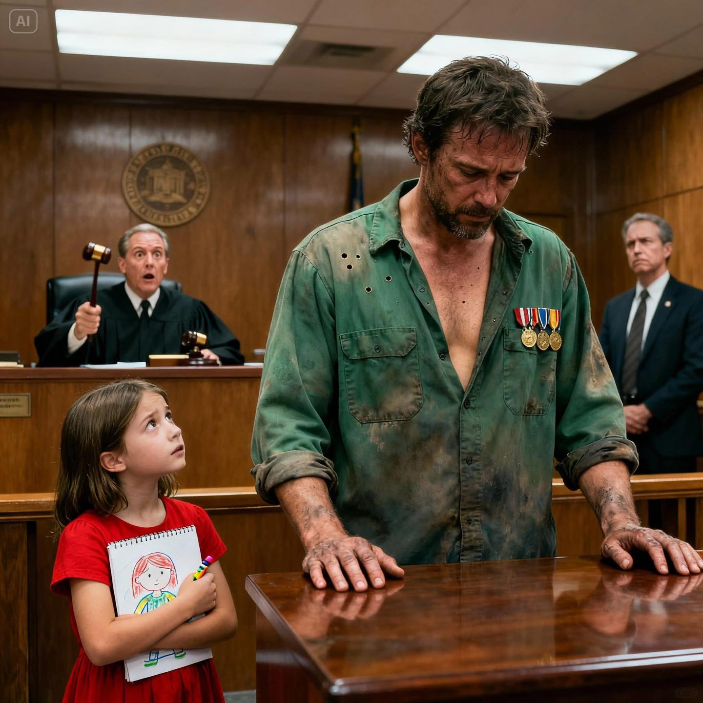 At the defense table, Daniel Foster stood in a faded green work shirt, his back straight, his face a mask of calm. He seemed out of place in that polished room, like a man pulled from another time and dropped here by mistake. The medals pinned to his chest caught the fluorescent lights in dull, tarnished glints. Beside him, a little girl in a red dress held his hand, her tiny fingers wrapped tight around his.