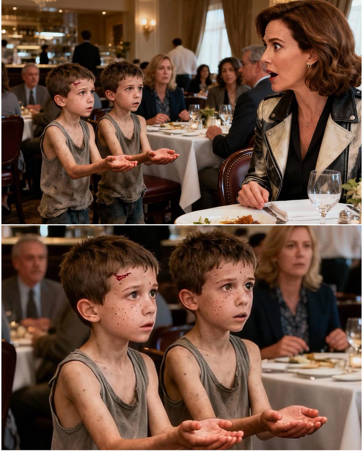 The taller twin flinched at the sharp sound of the fork, then straightened. “We’re sorry, ma’am,” he said quickly, his voice tense with practiced apology. “We’re just… we’re hungry. We don’t want money. Just food you’re not eating.”