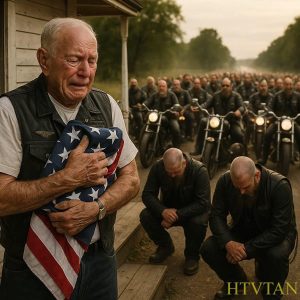 The flames licked higher, tearing through cloth that once draped proudly over battles long past. An 81-year-old veteran stood helpless on his porch, tears streaking his weathered face as thugs laughed, stomping out the ashes of his American flag. What they didn’t know, the roar of 50 Harleys was already on its way.
